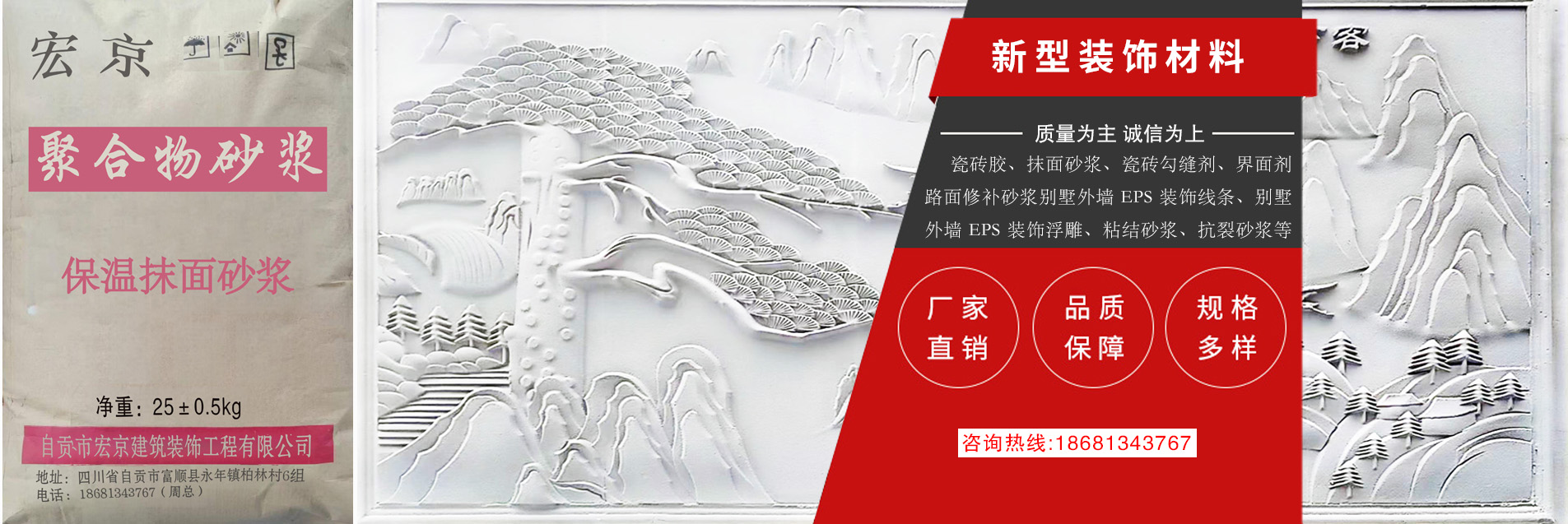 自貢市宏京建筑裝飾工程有限公司,成立于 2018 年,廠房位于位于四川省自貢市富順縣永年鎮柏林村 6 組柏林村小。本公司集保溫材料聚合物改性水泥基砂漿材料研發、生產、銷售于一體的干粉砂漿材料公司。 公司基于低碳、環保、綠色、節能的經營理念,生產推廣高效、節能、環保的新型保溫材料等產品。本公司 產品具有質量優良、良好技術、精湛工藝、成本低等優勢。公司成立以來,一直視產品質量為企業的生命, 堅持“質量為先,顧客至上”的服務宗旨,贏得了客戶的信賴,并建立了完善的售前售后服務體系,歡迎各 界來